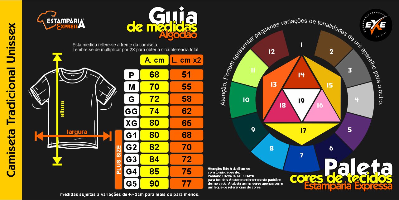 Na Estamparia Expressa, cuidamos de cada detalhe para que seu pedido seja prático, rápido e com a qualidade que você procura. Confira agora mesmo a tabela de medidas e a paleta de cores disponíveis na imagem desta página e faça já o seu pedido de camisetas personalizadas em algodão!