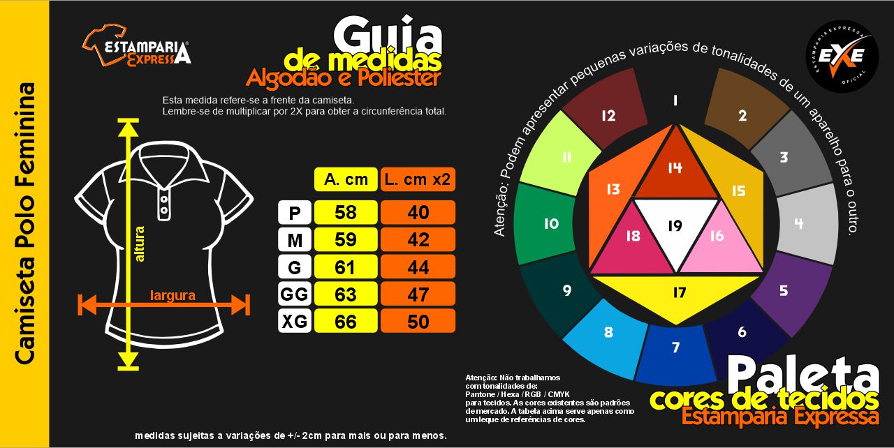 Na Estamparia Expressa, cuidamos de cada detalhe para que seu pedido seja prático, rápido e com a qualidade que você procura. Confira agora mesmo a tabela de medidas e a paleta de cores disponíveis na imagem desta página e faça já o seu pedido de camisetas Polo Femininas personalizadas em algodão e poliéster!